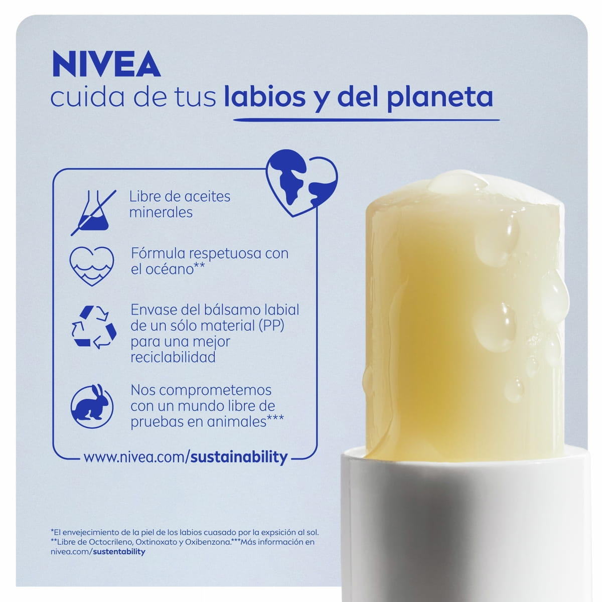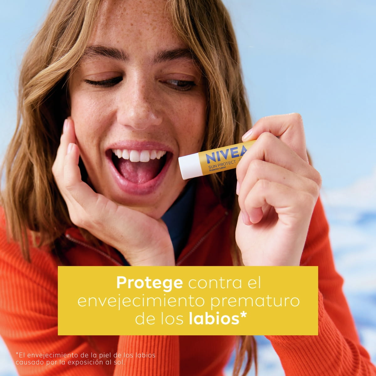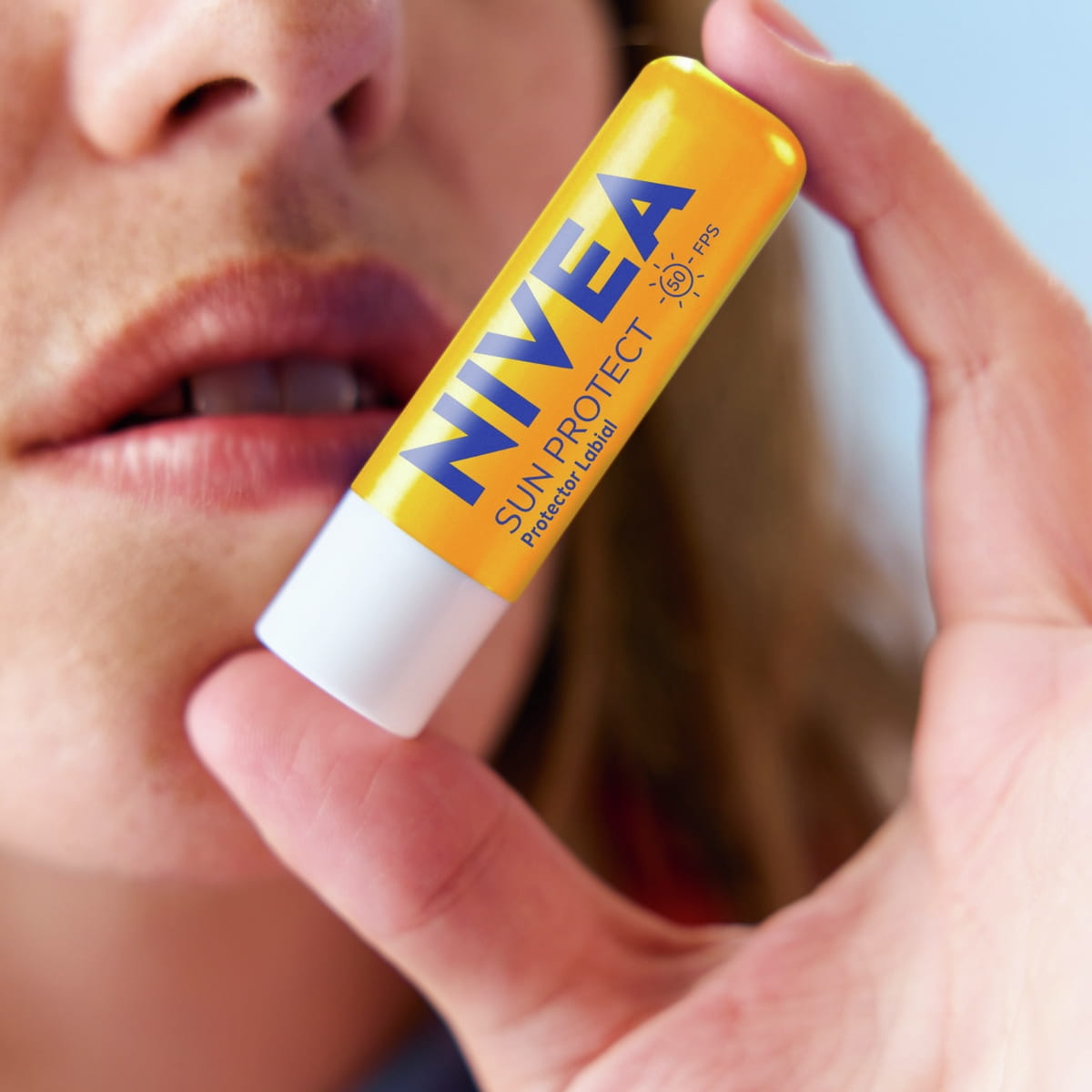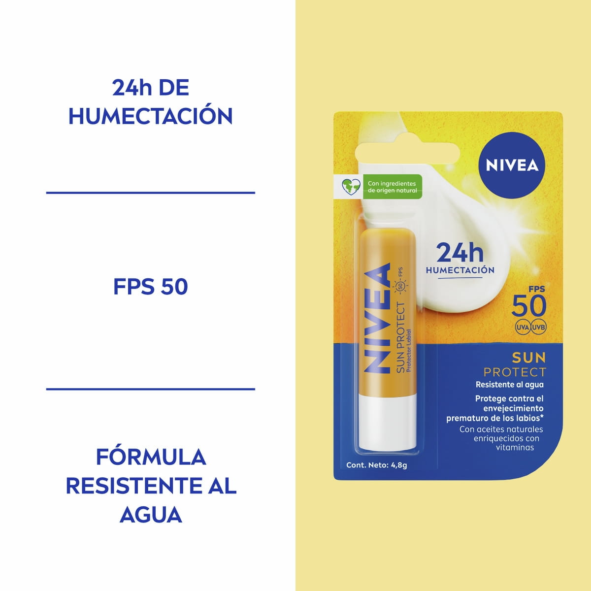 El Protector solar labial NIVEA Sun Protect cuida los labios del sol. Su fórmula con Aceites de origen natural y Manteca de Karité que se funden fácilmente en los labios, manteniéndolos humectados por 24 horas. Además, contiene FPS 50 que protege intensamente los labios de los rayos UVA/UVB y de los efectos dañinos del sol